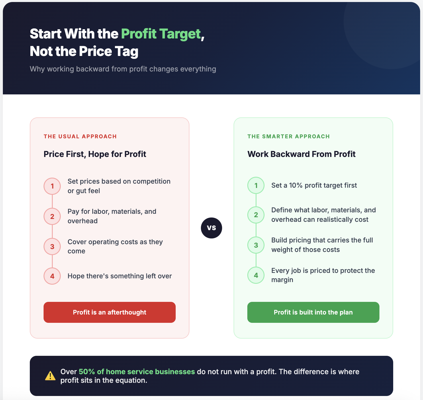 Home service business profitability is built on visibility. Gross margin has to be strong enough to pay for the rest of the business. Job costing has to capture the real cost of each job. A price book has to turn those costs into calculated pricing instead of guesses. When those systems are missing, a business can stay busy and still fail to produce profit. When they are in place, the owner can budget backward from profit, price work with confidence, and see where the business is actually performing. In HVAC, that foundation matters before growth, not after it.